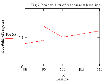 "What a delightful step feature on hypertension hill," I said, "are you sure that you would not like a couple more, say one a little higher up and one lower down." "Are you being sarcastic?," she replied. "The criterion I propose has been used in the scientific literature and is well accepted". "Well not by me, "I added. "Let us suppose for argument's sake that the mean DBP is 100 at baseline in the treatment group, the standard deviation is 10, the treatment effect is to reduce DBP by 10 and the correlation coefficient between baseline and outcome is 0.7." (I meant, of course, the Pearson product moment correlation coefficient, not the tetrachoric one.) "Then this is what the probability of response looks like as a function of the baseline value. Note the delightful ski-jump feature on pressure piste."