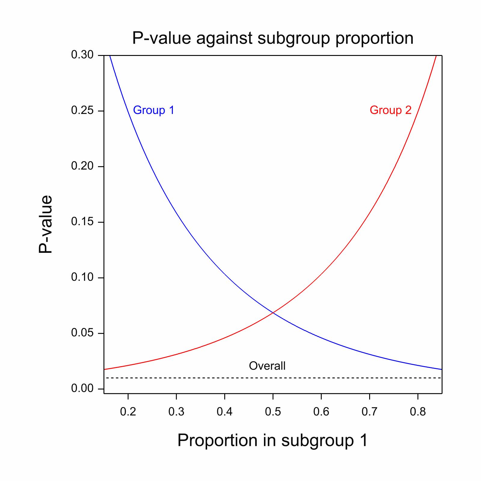'Exactly. And so if you require both subgroups to be significant the best position to be in is to have half the patients in each sub group and unfortunately that gives you a P-value of about 0.07.'